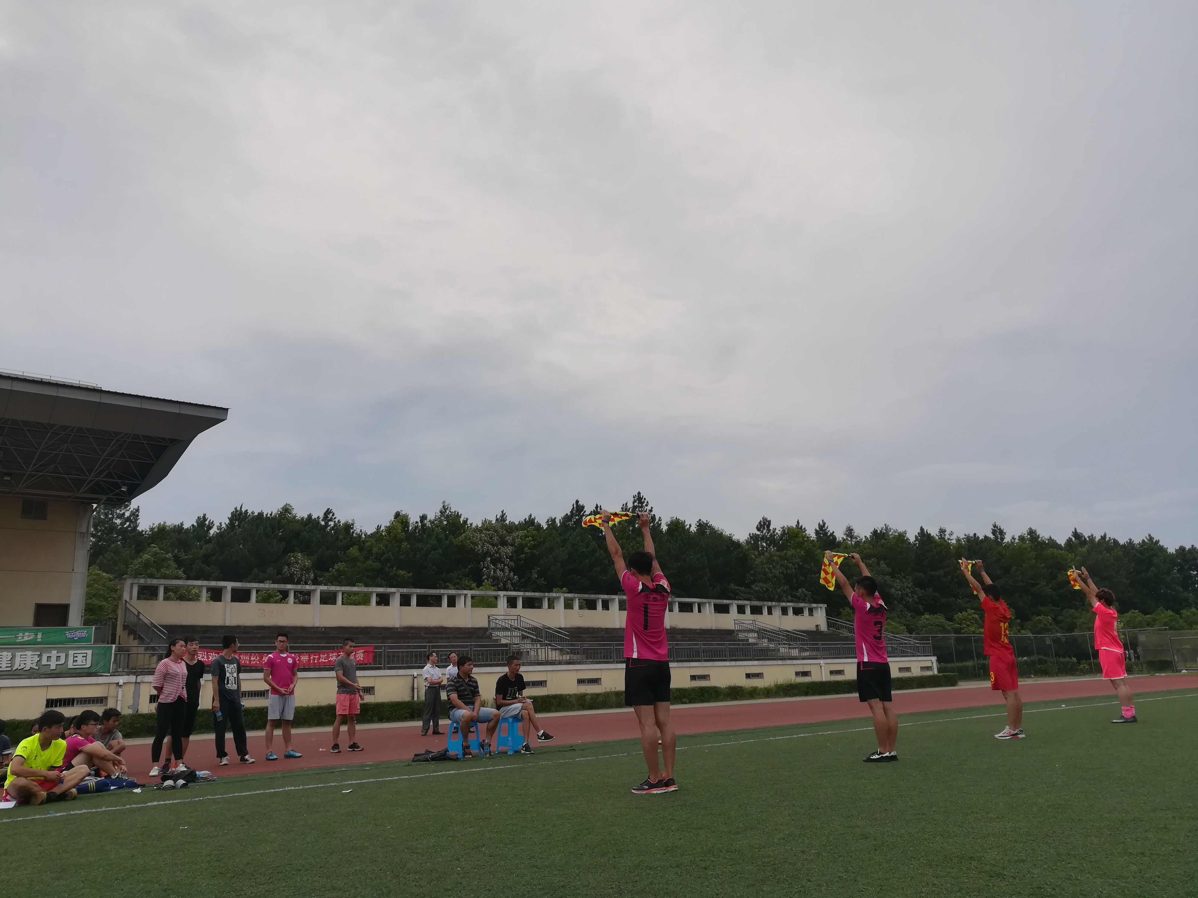 第二阶段由王玮和王前进老师在北区田径场为学员上实践课,主要包括裁判员的跑位和手势、助理裁判员的旗势和临场实践教学。经过两位老师的理论和实践培训后,学员们带着裁判员装备跃跃欲试。老师将学员分成三组,其中两组模拟球员踢足球比赛,另一组担任裁判员执裁。在场上,裁判员临场时犯的错误两位老师都耐心的纠正,每位学员都收获满满也不禁感慨“理论加实践才是硬道理”。