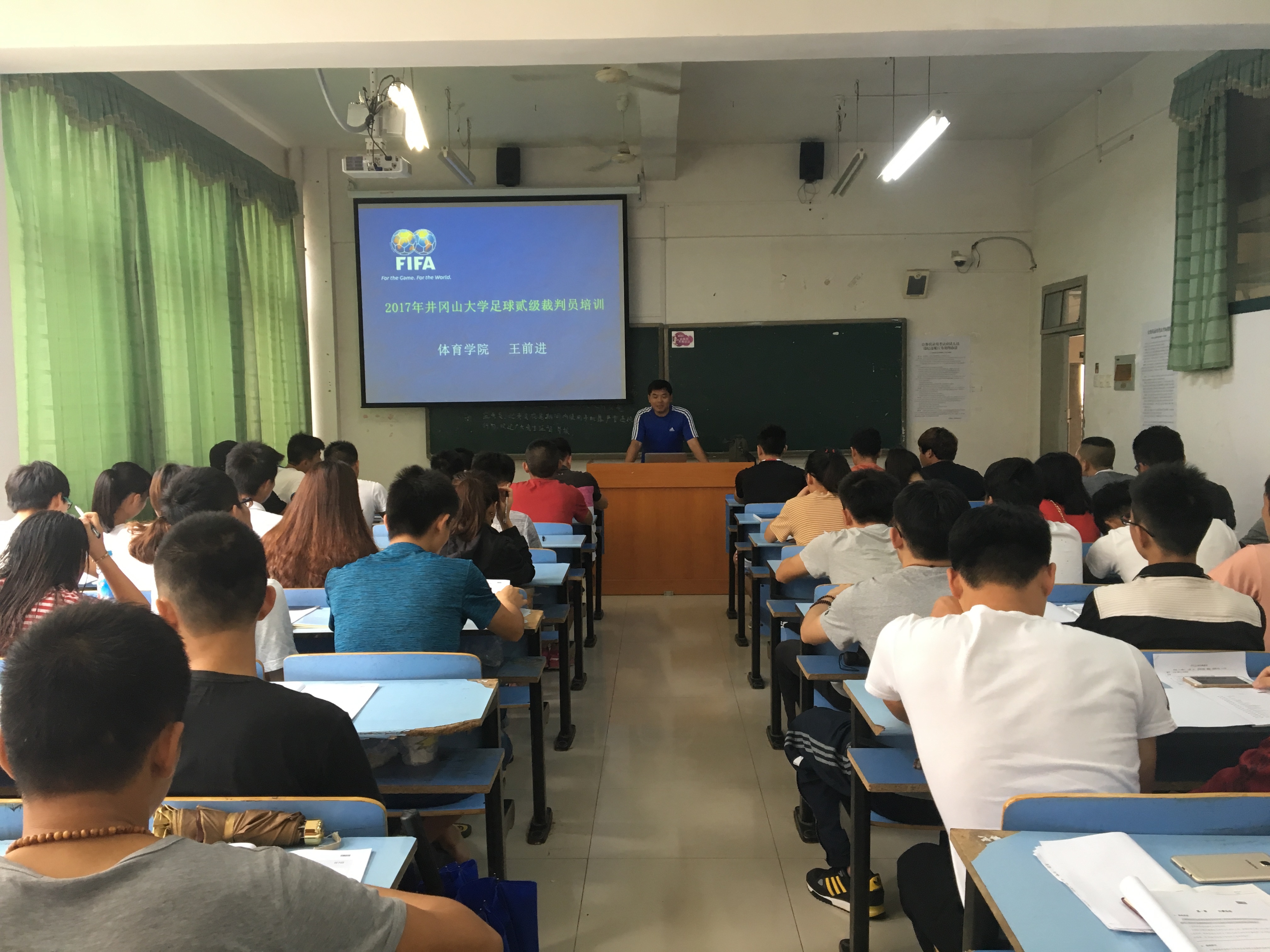 为全面贯彻落实国务院关于足球改革发展的总体部署,提高我校足球裁判员的业务能力和工作水平,进一步推动我校足球运动的普及与发,2017年6月28日井冈山大学首届国家二级足球裁判员培训班在十栋A105室正式开班。本次培训班为期2天,由井冈山大学体育学院和吉安市体育局举办。参加培训的学员共计五十余人,由体育学院足球博士王前进老师和足球教练王玮老师为学员授课。吉安市市体育局对本次培训班很关注,相关领导也来到培训现场考察。