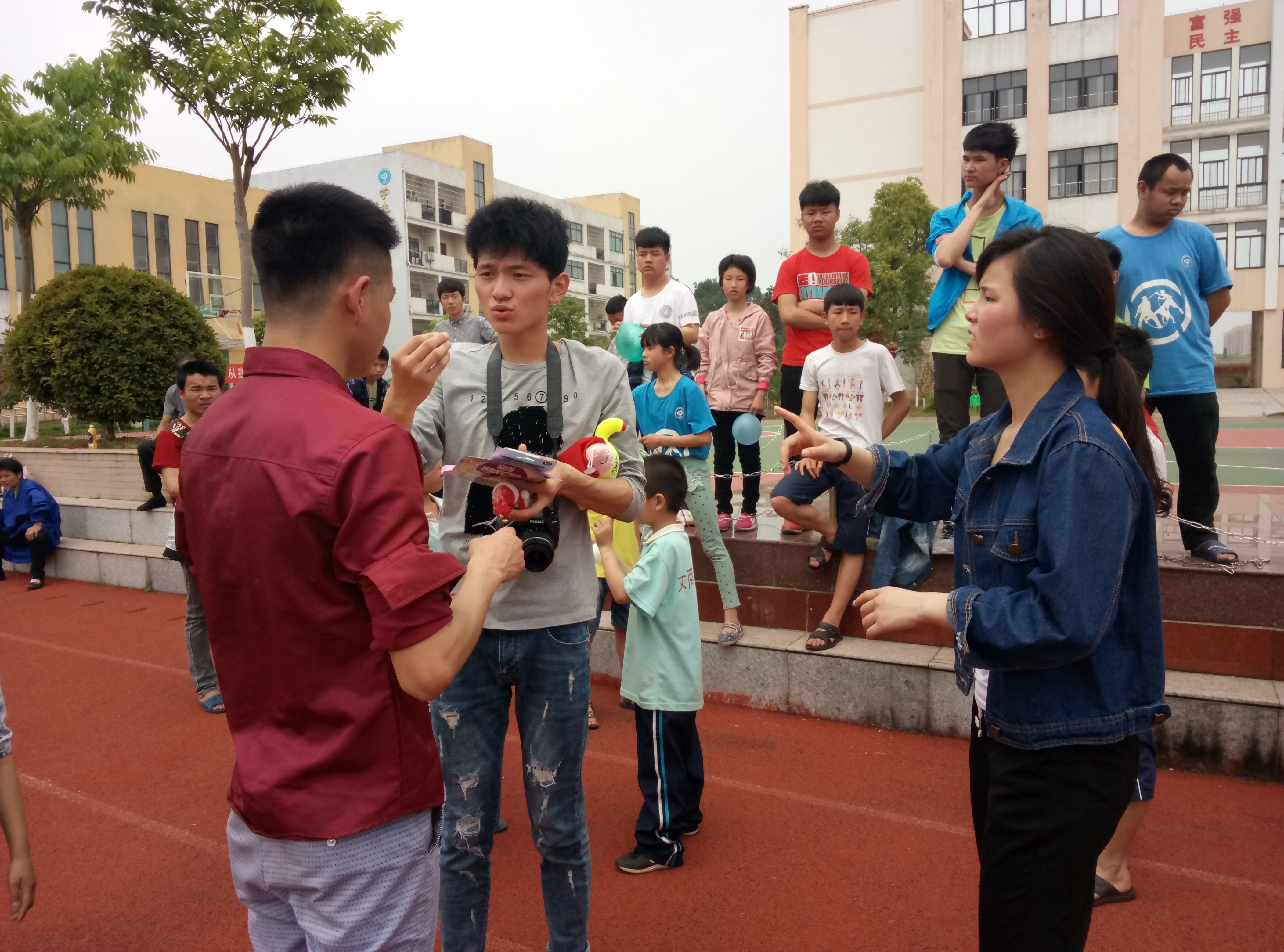 在活动伊始,爱心社的成员们到达特殊教育学校,集合分配任务,开始准备活动需要的器材。活动进行中,爱心社的成员们带领特校的孩子们一起玩了60秒趣味跳绳、五十米接力、两人三足、夹气球、拔河比赛等游戏,虽然这群特殊教育学校的孩子们听不到声音也发不出声响,但整个活动现场却弥漫着欢快的气氛。孩子们的眼神里我们看到了同样的纯真和友善。虽然不能用语言交流,但他们用眼神、用手势、用心灵在交谈。活动最后爱心社的成员们与特殊教育学校的老师同学们合影,分发奖品。
