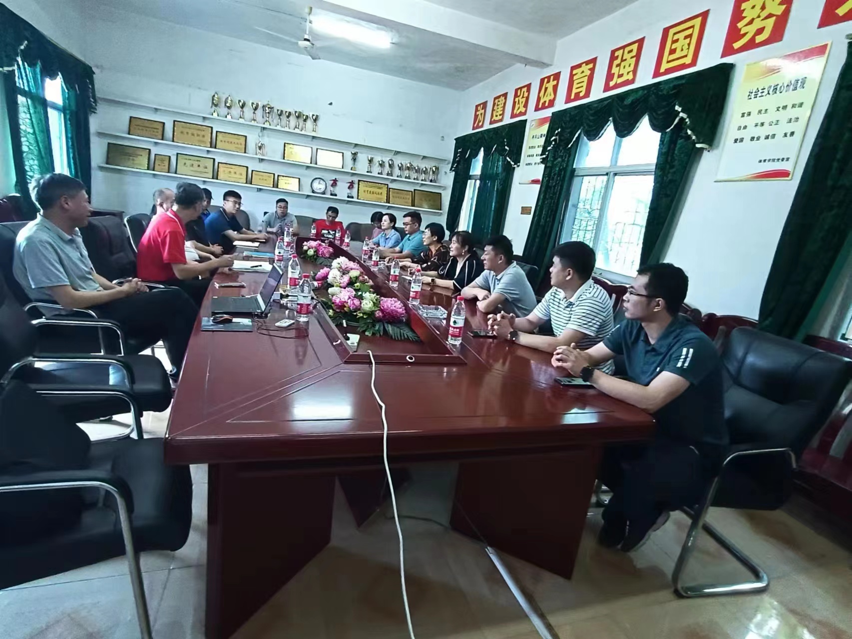 6月15日下午,豫章师范学院体育学院院长梁芳一行莅临学院访问交流,党委书记罗曙琼、院长熊百华、党委副书记史桂忠、副院长胡达道、王前进、邹利民及体育系负责人王玮出席会议,会议在学院二楼会议室举行,由院长熊百华主持。