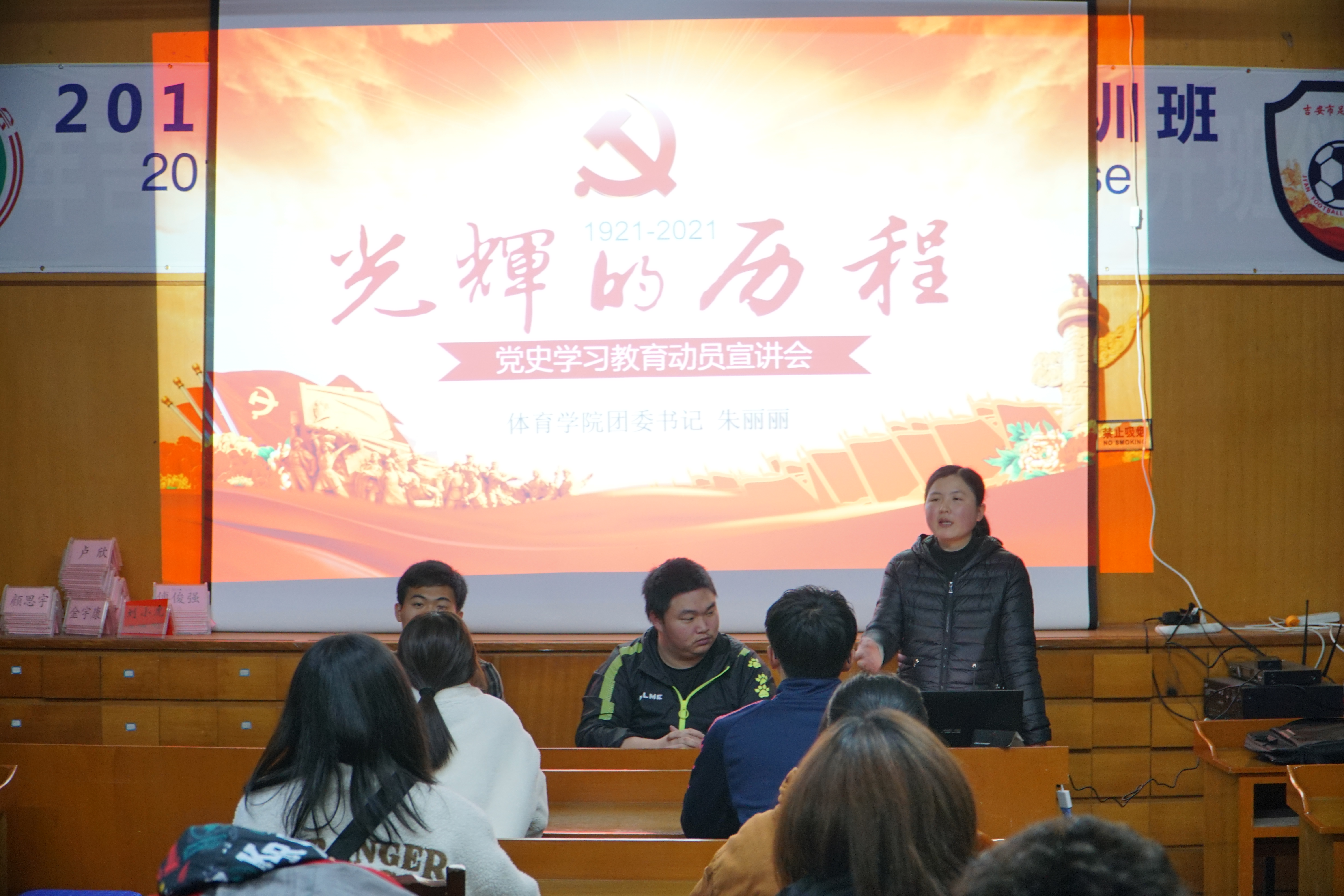我院团委老师面向大骨班成员做党史学习教育动员宣讲会 2021年03月16 学院新闻 3月13日晚,我院团委书记朱丽丽面向大骨班学生做了宣讲,题为“光辉的历程,党史学习教育宣讲会”。大骨班39名成员参加学习。 朱丽丽首先带领同学们学习了习近平在党史学习教育动员大会上的讲话,随后从理论发展角度和时间发展角度对党史的时间脉络进行了梳理。接着,朱老师向同学们介绍了共产党员网上丰富的学习资源,希望同学们多关心国家大政方针,学会将个人发展紧紧融入党和国家发展的需要,青春建功新时代。最后,朱老师还布置了课后作业,要求同学们通过网络观看“党史学习故事100讲”,学党史,悟思想,干实事。 分享到:QQ好友微信QQ空间新浪微博人人网复制网址打印