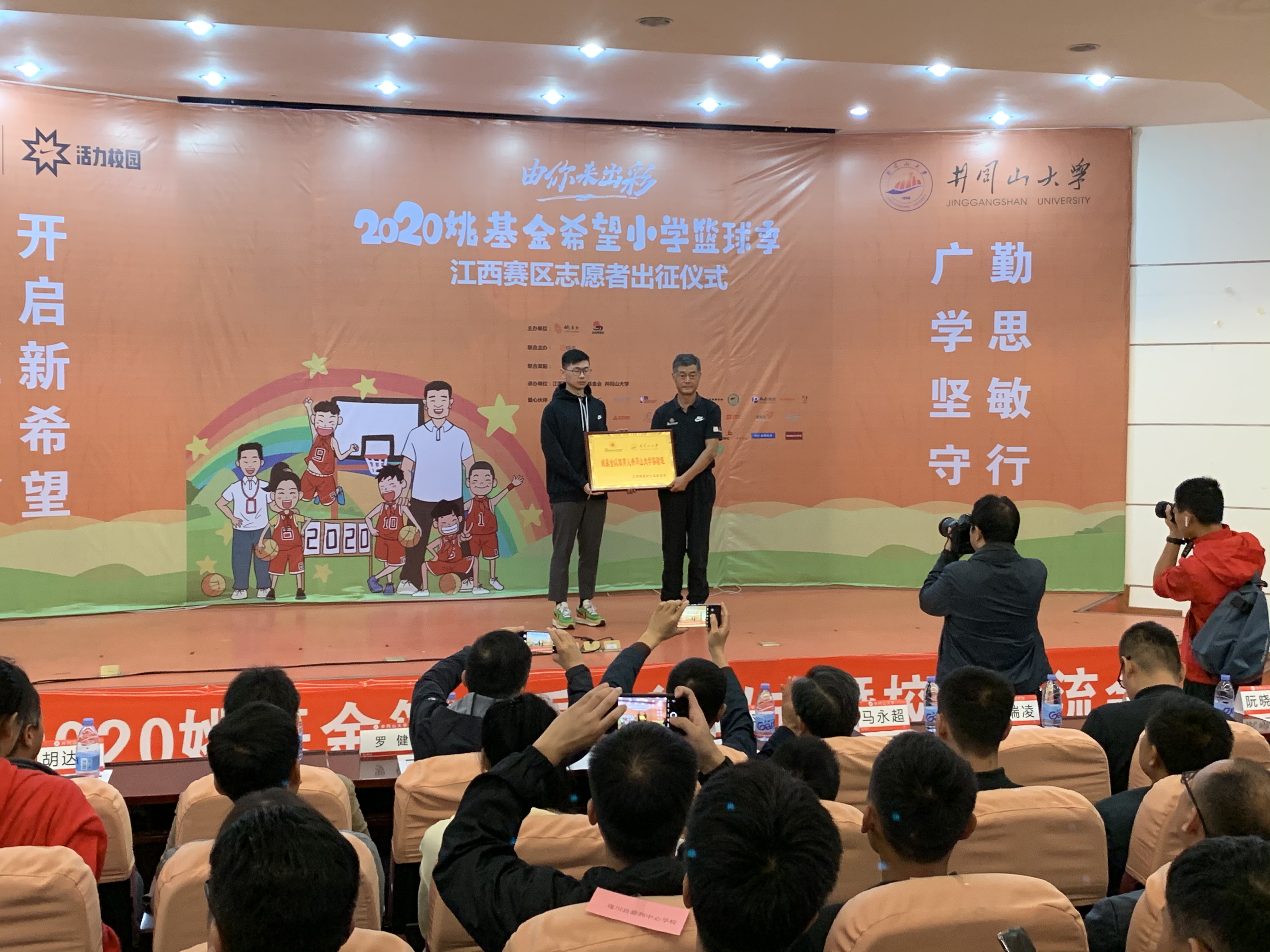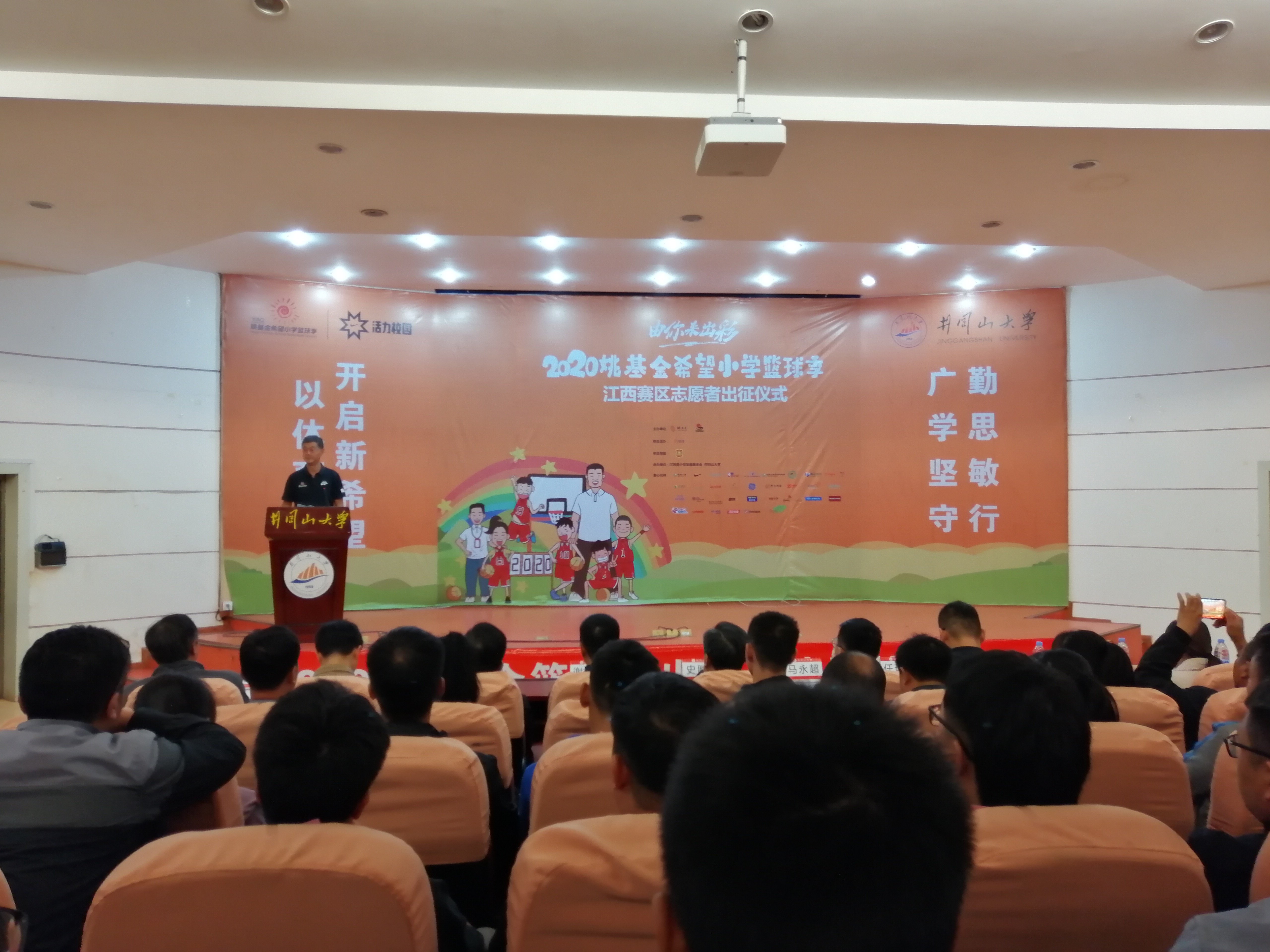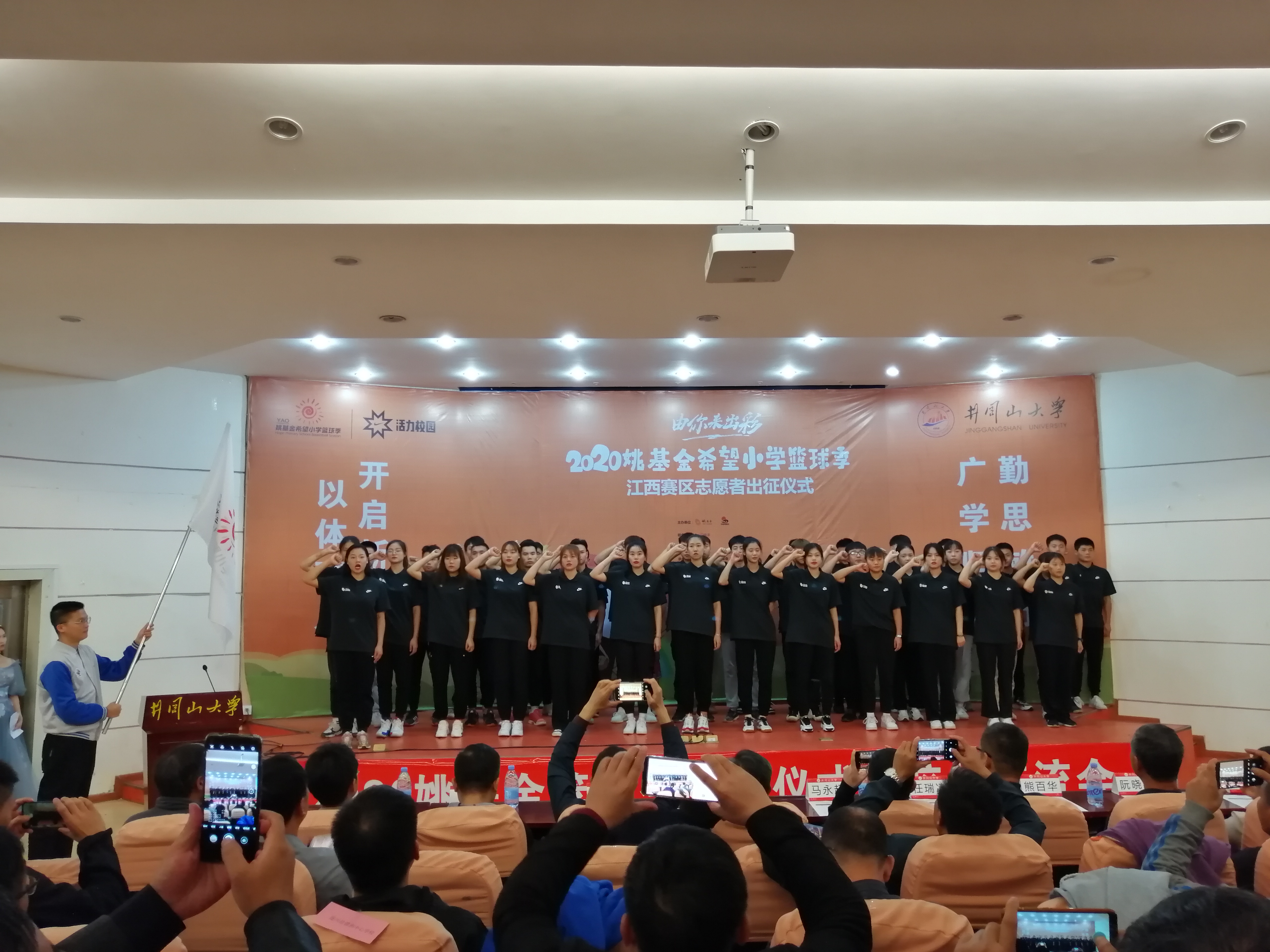 10月9日上午,2020年“姚基金希望小学篮球季”志愿者支教出征仪式暨校长交流会在校举行,党委常委、纪委书记史胜平为志愿者出征授旗,并宣布志愿者出征,姚基金高级项目主管代表姚基金向我校体育学院“姚基金”实验班授牌,院长熊百华致开幕词。我院42名篮球支教志愿者上台进行宣誓。姚基金赛事顾问、江西省青少年发展基金会、吉安市教体局有关负责人以及来自各县市农村小学的30余名校长出席了仪式。