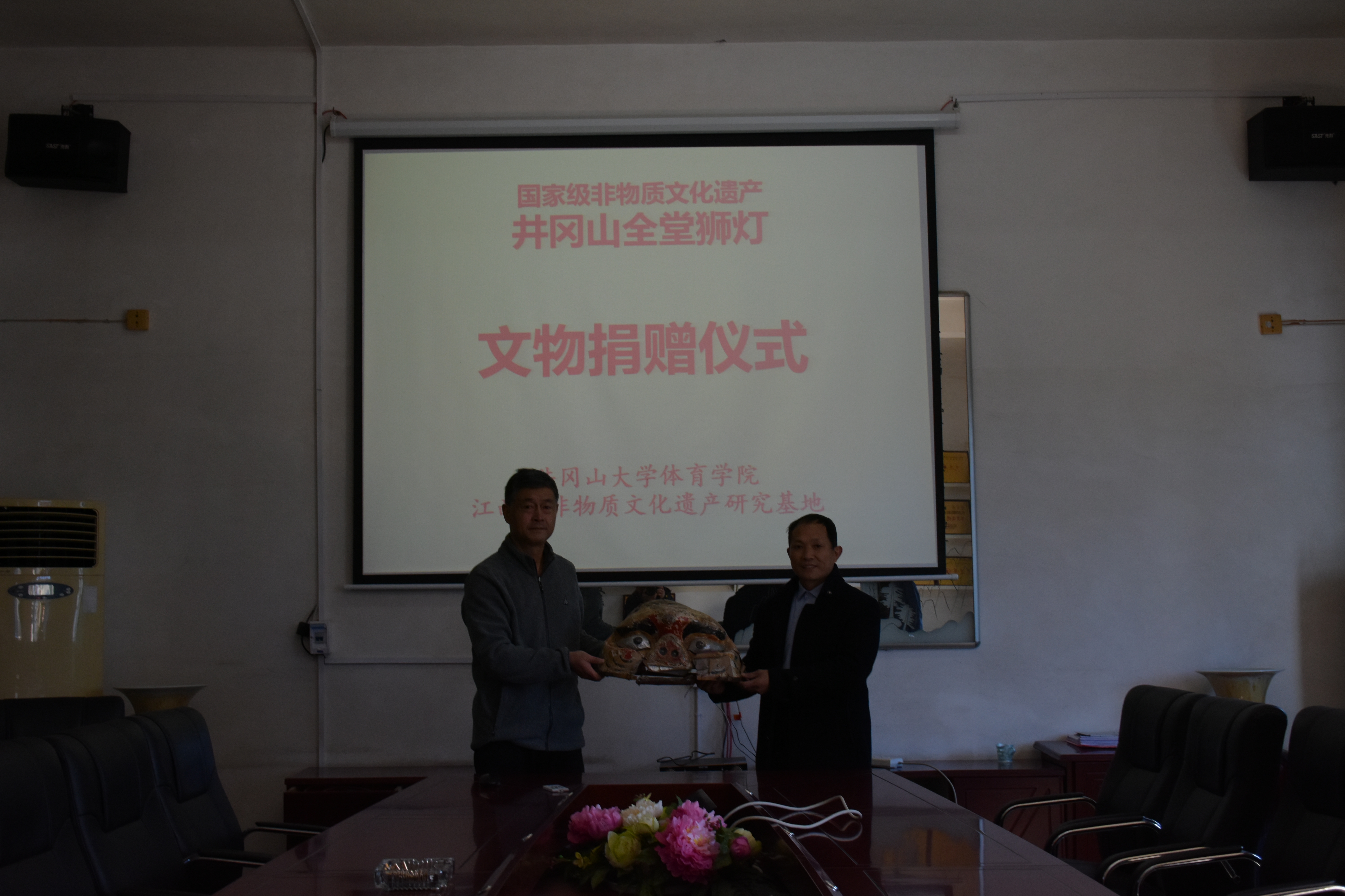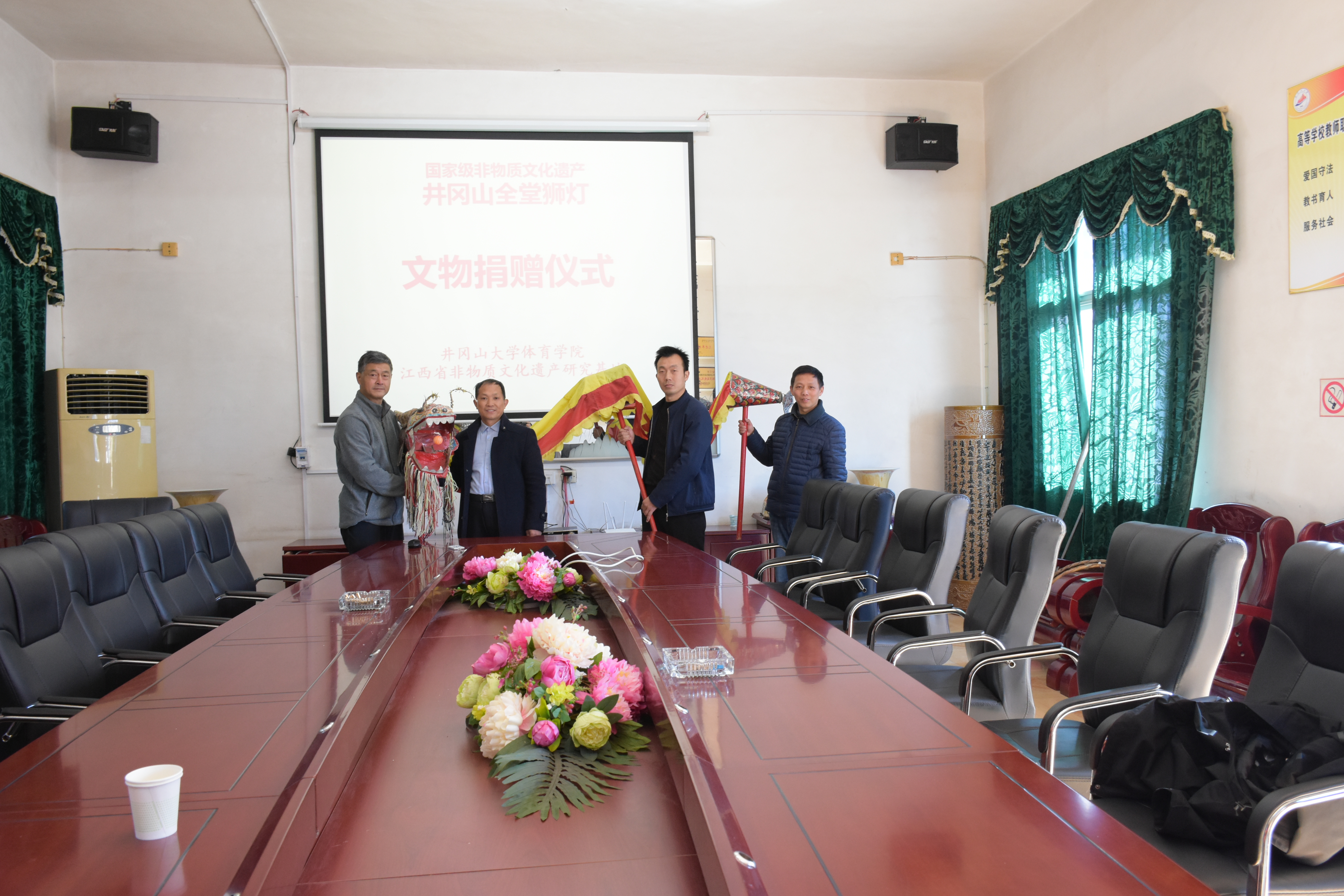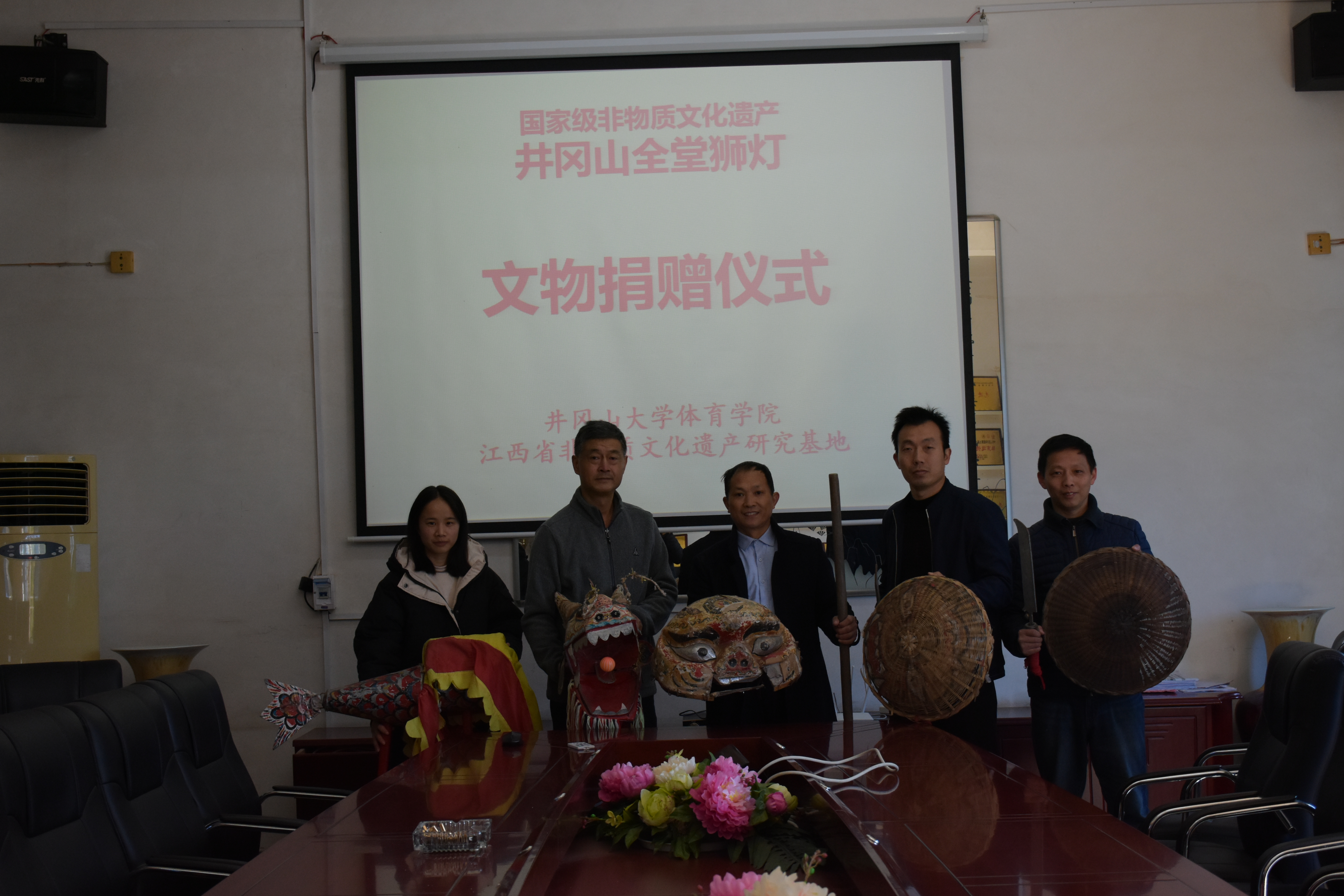 国家级非物质文化遗产井冈山全堂狮传承人向我院捐赠全堂狮灯 2019年12月10 学院新闻 12月9日,国家级非物质文化遗产井冈山全堂狮灯传承人林文辉向我院捐赠了一套全堂狮灯。院长熊百华出席了捐赠仪式,部分非物质文化遗产研究基地人员参加了捐赠会议。 会上,双方就下一步的传承与合作达成了初步协议。 分享到:QQ好友微信QQ空间新浪微博人人网复制网址打印