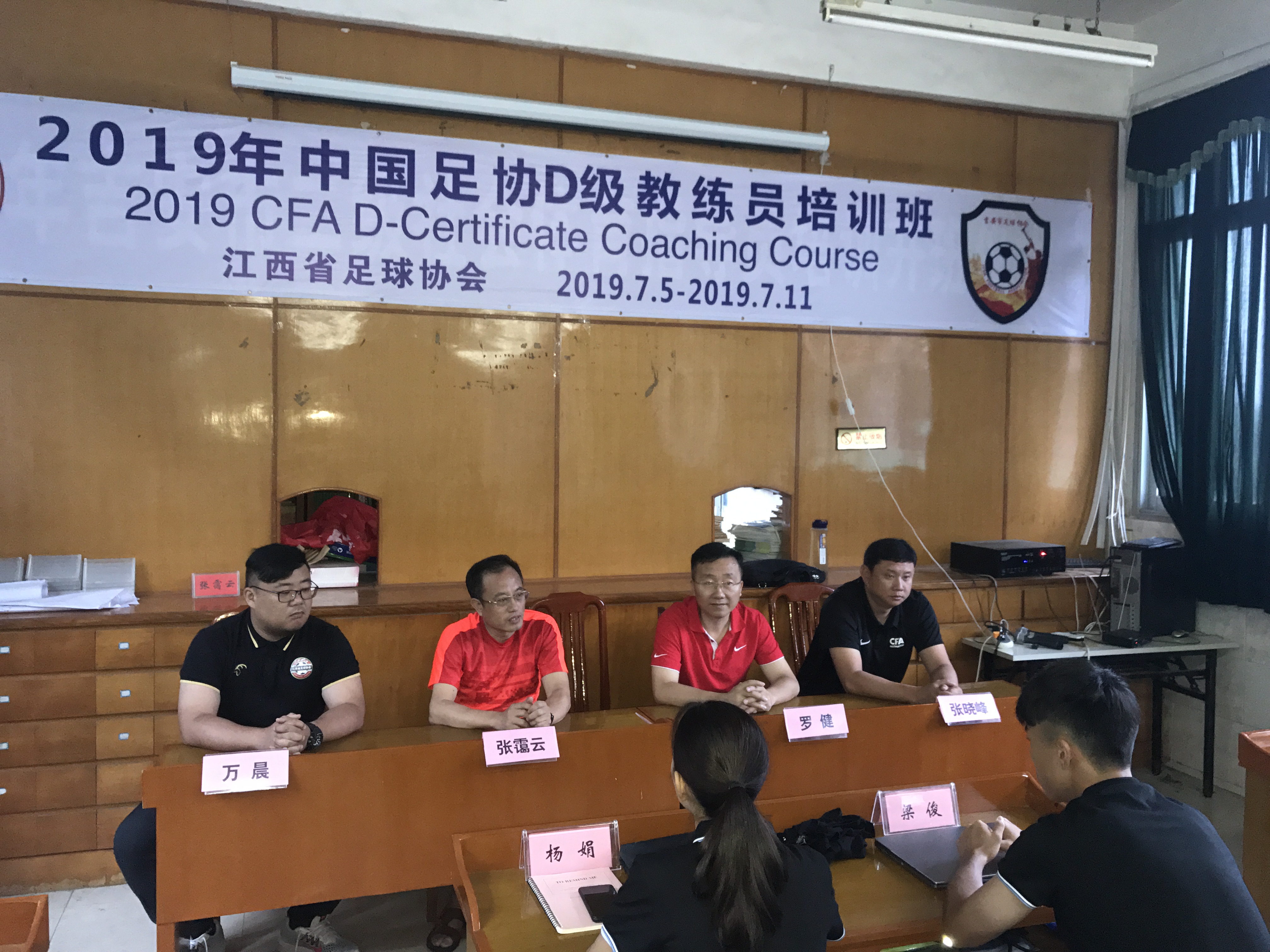 7月5日上午,由中国足球协会主办,江西省足球协会承办,井冈山大学体育学院和吉安市足球协会协办的2019年中国足协D级教练员培训班在我校举行。体育学院党委书记张霭云、吉安市教育体育局副调研员罗健、江西省足协技术部主任万晨和大连一方足球俱乐部青训总监并担任本次培训班主讲师的张晓峰出席开幕式并讲话。