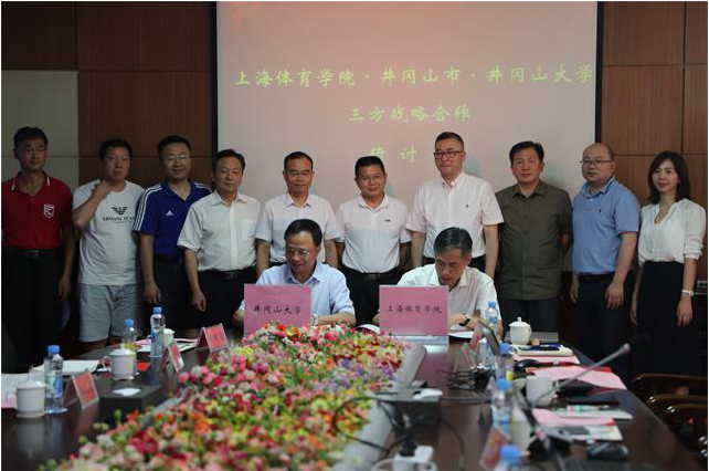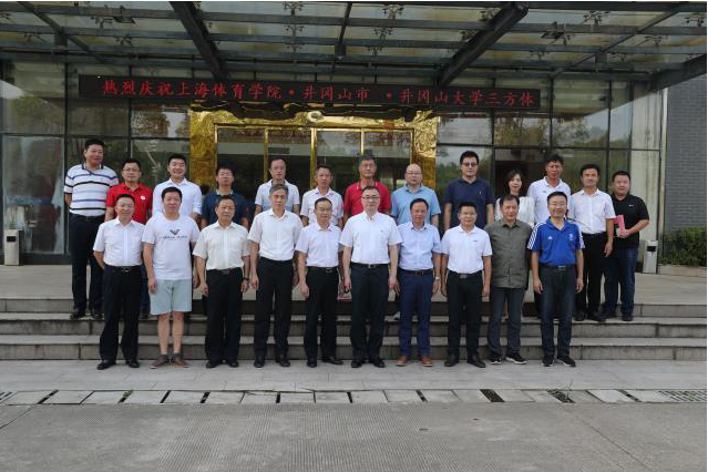 8月8日,上海体育学院、井冈山市政府、井冈山大学三方体育产业战略合作项目研讨会在校举行。上海体育学院党委书记李崟,上海体育学院党委副书记、副院长陈晓峰,副院长王兴放,井冈山市副市长王克康,井冈山大学党委副书记温和瑞,党委常委、副校长陈小林出席研讨会和签约仪式,井冈山大学党委常委、纪委书记史胜平主持签约仪式。上海体育学院有关部门、学院,江西省体育局,吉安市教体局,井冈山市教体局以及上海市登山运动协会,上海赛事组织运营团队,井冈山市中翔体育文化传播有限公司,我院党委书记张霭云 、院长熊百华、副院长胡达道和学校相关学院、部门等负责人参加了研讨会和签约仪式。院长熊百华代表我院作了研讨发言。
