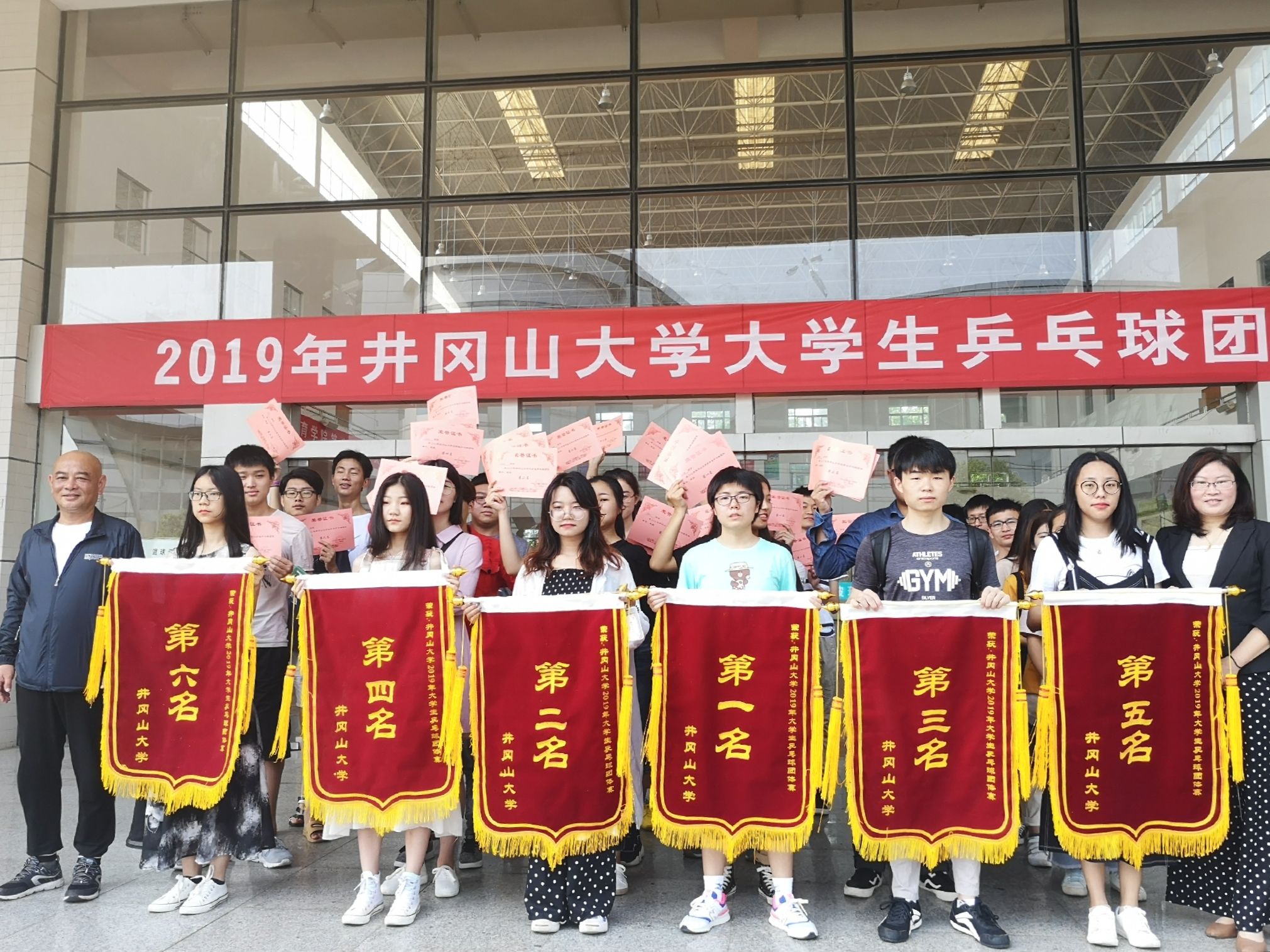 5月12日上午九点,在体育馆门口举行了颁奖仪式,体育学院系主任陶干臣,负责老师阮小娟出席活动现场,给获奖队代表授予荣誉证书和奖品,给获奖学院颁发锦旗。学校和体育学院的全力支持、阮小娟老师的策划指导、乒乓球协会工作人员的组织共同促成了2019年大学生乒乓球团体赛的圆满落幕。
