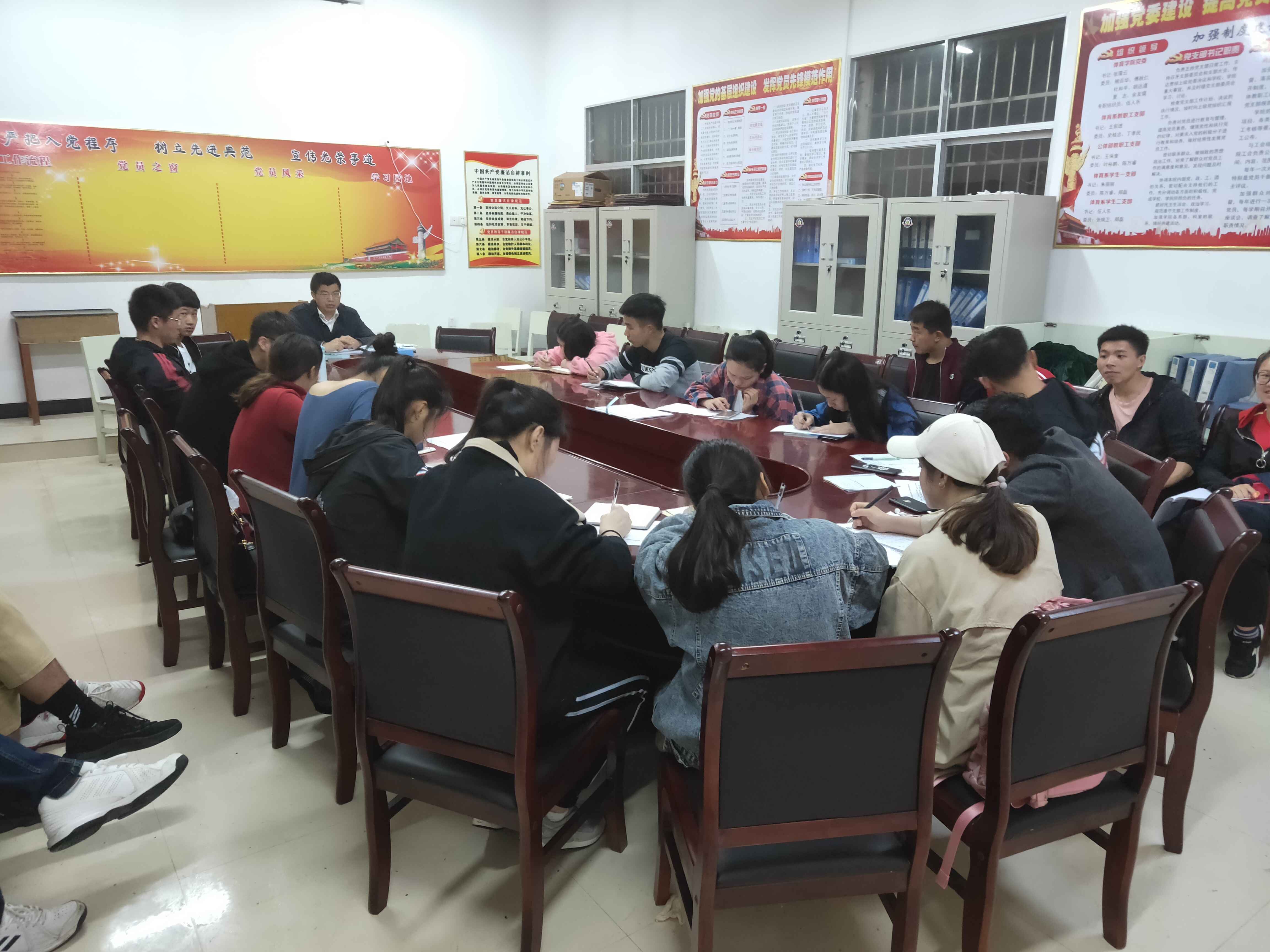为深入学习贯彻全省教育大会精神,加强学生党员党性修养,2019年3月26日晚上,体育学院在党员活动室组织全体学生党员召开了学习王雨、谢盛纹两位老师先进事迹专题会议。会议由体育学院学生党支部书记伍人乐主持。
