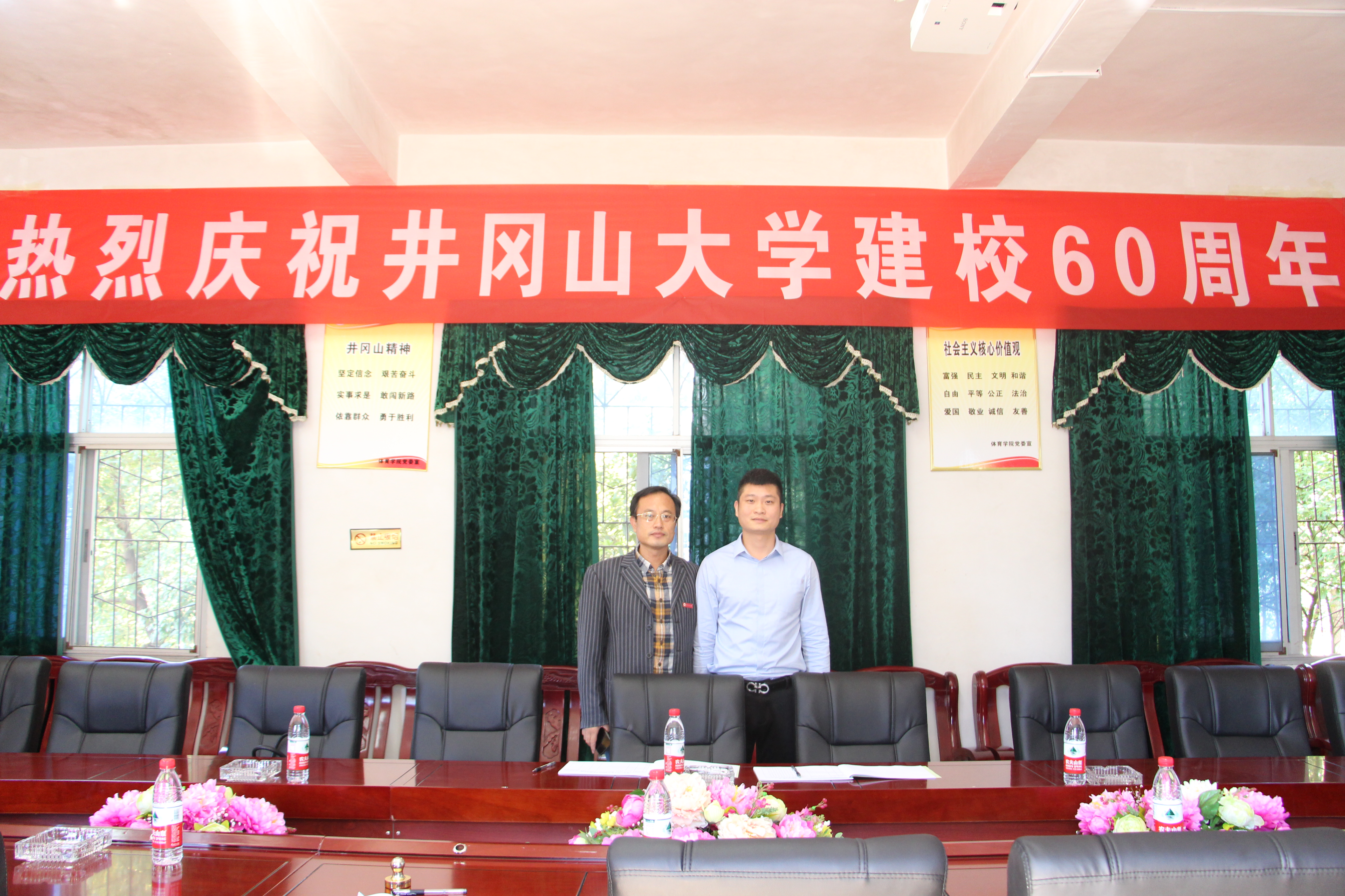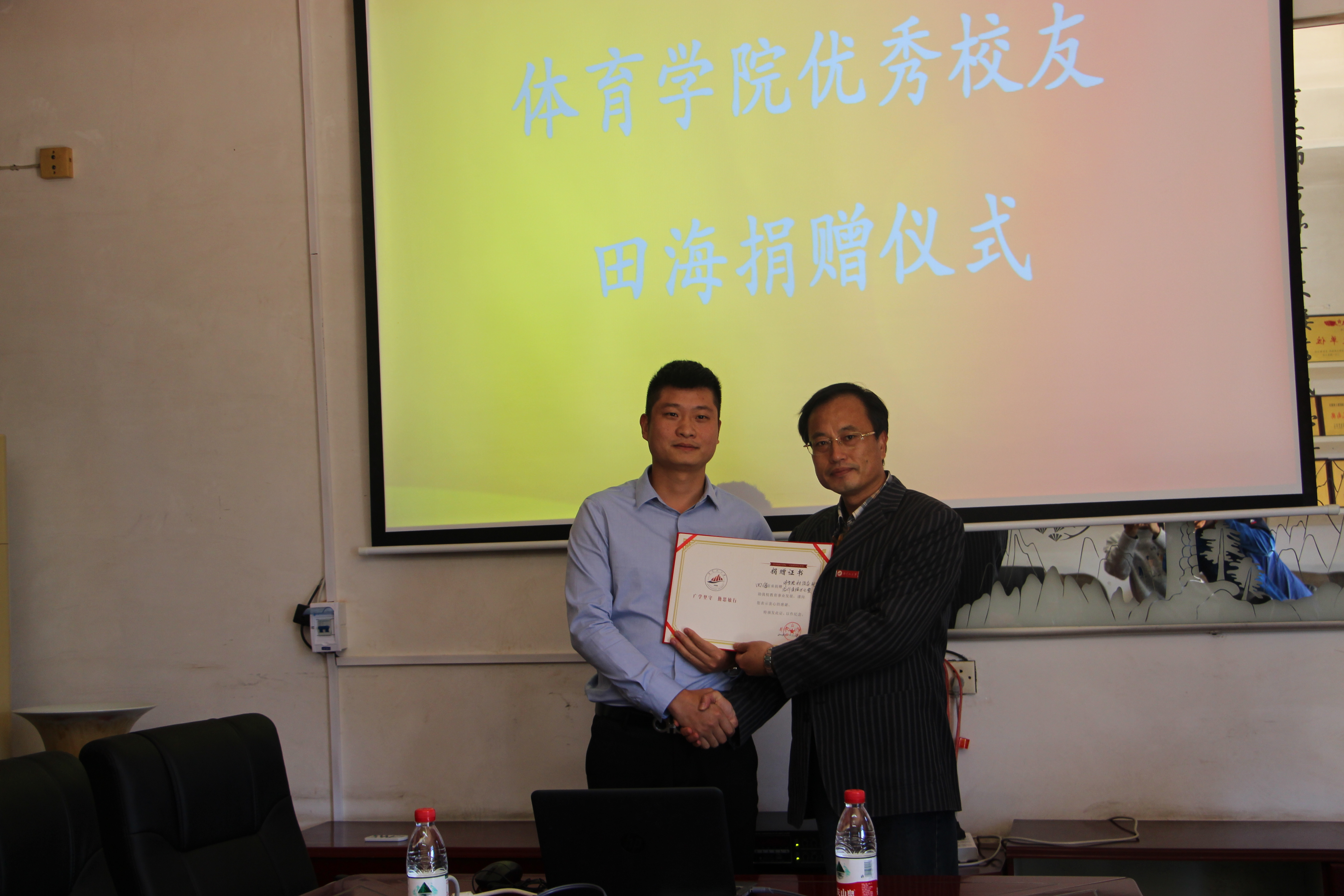 10月28日上午,我院07级体教本2班校友田海先生为感恩学院,回馈母校,庆祝学校60周年华诞,慷慨解囊,为学院捐赠总价值伍万元的场地器材设备(乒乓球场地),另捐赠现金壹万元。学院党委书记张霭云主持捐赠仪式,团委书记伍人乐、学生科等工作人员参加,田海先生一行出席捐赠仪式。会上,张霭云代表学校向田海先生颁发了捐赠证书。