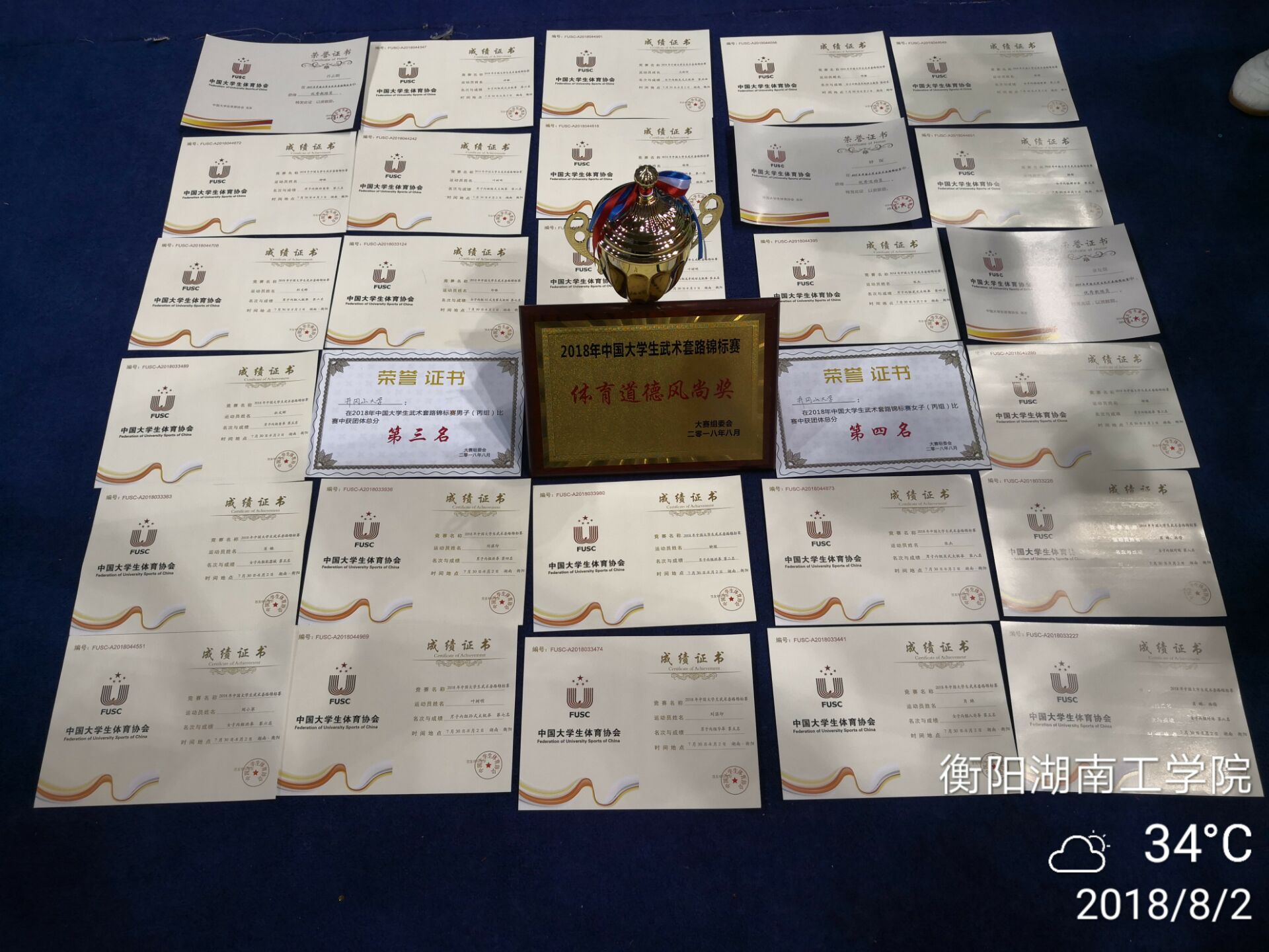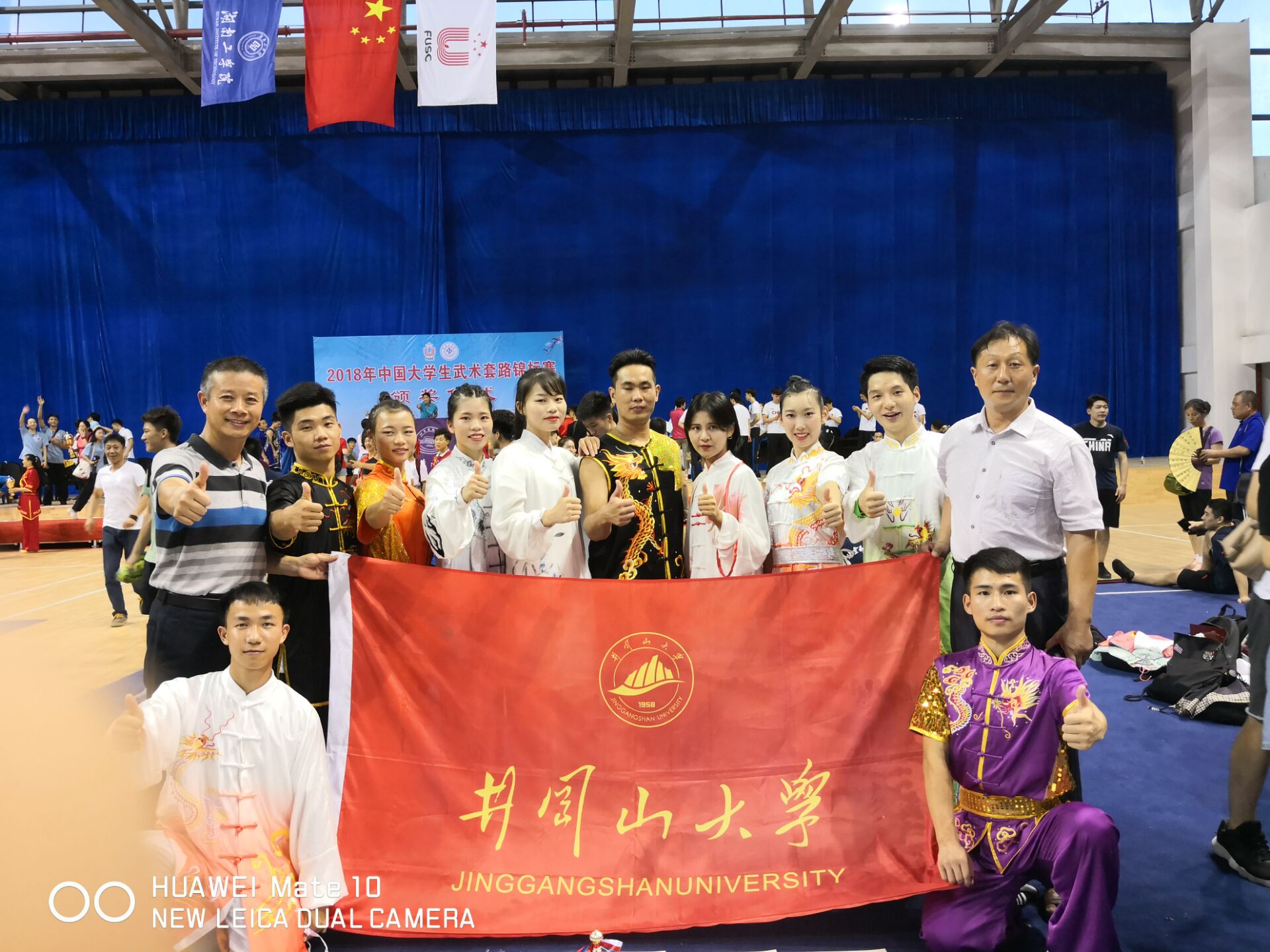 7月28日至8月2日,2018年中国大学生武术套路锦标赛在湖南工学院举行,我校10名大学生参加了本次比赛。经过4天紧张激烈的角逐,我校代表队共获得1金1银3铜、3个第4名、7个第5名、4个第6名、2个第7名、2个第8名,并取得男子丙组团体总分第3名、女子丙组团体总分第4名的历史性最好成绩。同时,获得体育道德风尚奖代表队称号,钟琛获得优秀运动员称号,余友儒、肖志鹏获得优秀教练员称号。