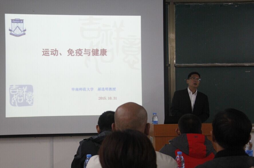 10月31日,华南师范大学体育科学学院运动生理学教授、博士生导师郝选明教授莅临我校,为我院师生作了题为“运动、免疫与健康”的专题报告,体育学院领导、教师、大三全体学生参加了报告会。报告会由副院长杜和平主持。