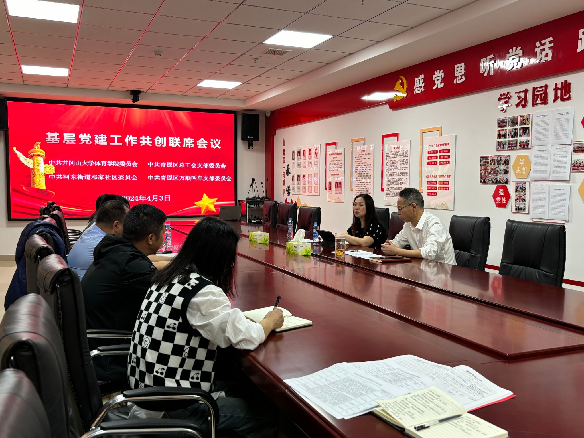 为进一步推动党建结对共创工作的深入开展,2024年4月15日,井冈山大学体育学院党委与青原区总工会党组、邓家社区党委、万顺叫车党支部等四家党建共创结对单位在青原区总工会召开第一次联席会议。体育学院党委书记习宁英出席会议。青原区总工会党支部刘兴华主持会议。共有15名党员代表参加。