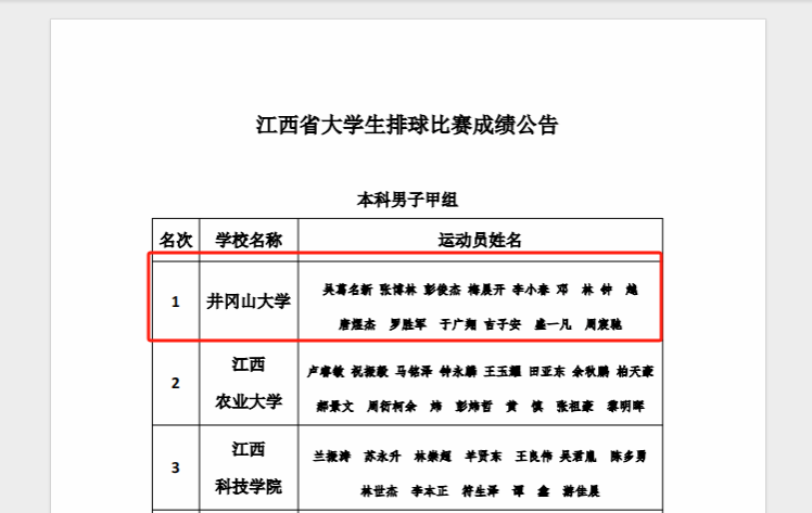 由江西省教育厅主办的2024年江西省大学生排球赛于9月20日至28日在井冈山市举行,我校本科男子甲组(普通组)、乙组(体育专业组)均获冠军,男子丙组(高水平组)获亚军,创我校参赛历史最好成绩。